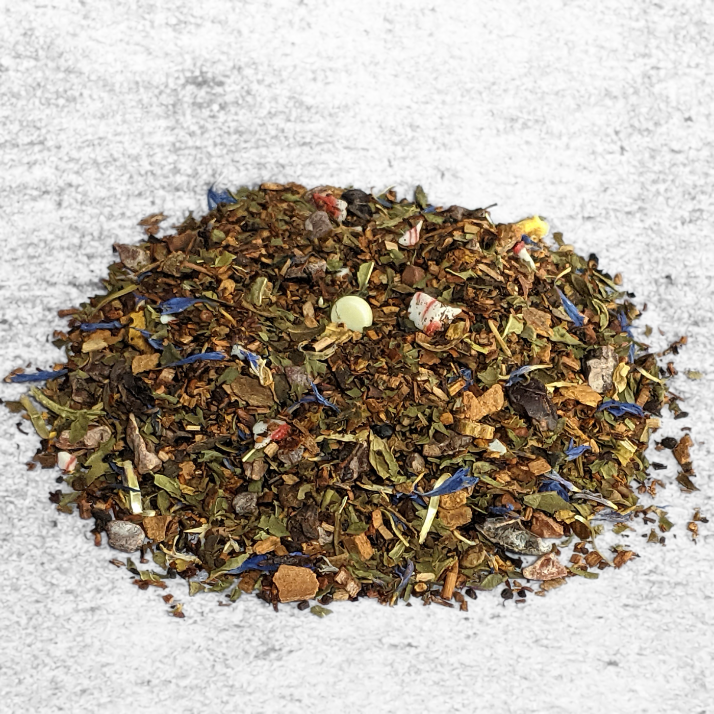 Ingredients: rooibos tea, honeybush tea, cocoa nibs, peppermint leaves, mini white chocolate chips (organic cocoa butter (vegan), organic cane sugar, organic tapioca starch, organic rice syrup solids, organic rice maltodextrin, organic vanilla, and salt), spearmint leaves, chicory, cinnamon, licorice, white chocolate flavor, blue cornflowers, dandelion root, natural hazelnut flavor, candy cane pieces.